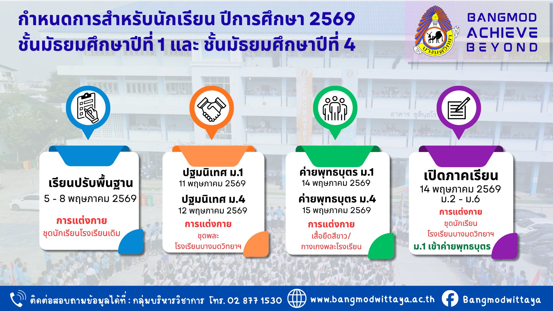 ( 08 เม.ย. 69 ) - ประกาศนักเรียนที่มีสิทธิ์มอบตัว เข้าศึกษาต่อระดับชั้นมัธยมศึกษาปีที่ 1 และ 4 ประเภทห้องเรียนปกติ ประจำปีการศึกษา 2569